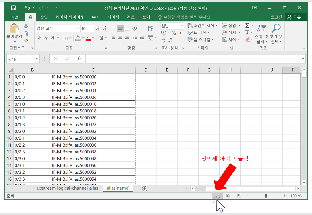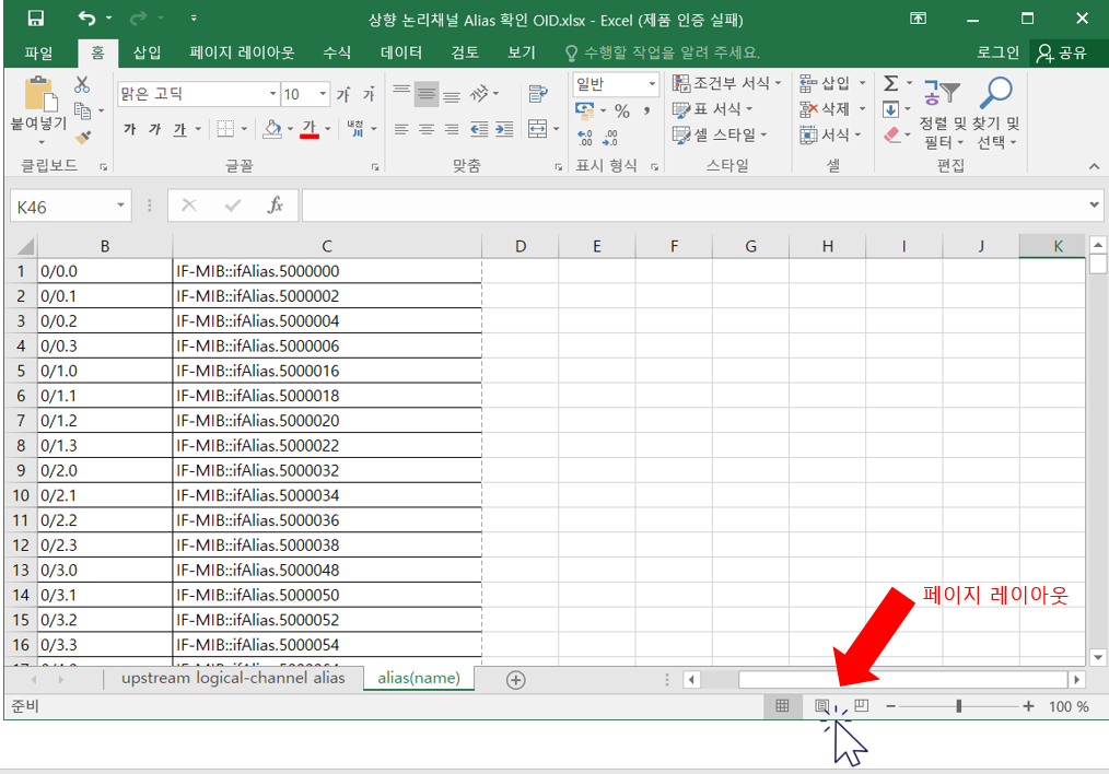 아래 그림과 같이 엑셀 문서를 띄운 화면에서 제일 아래쪽에 보면 작은 아이콘 같은 게 있는데요 두번째 아이콘이 '페이지 레이아웃'이라는 아이콘입니다. 해당 아이콘을 클릭합니다.