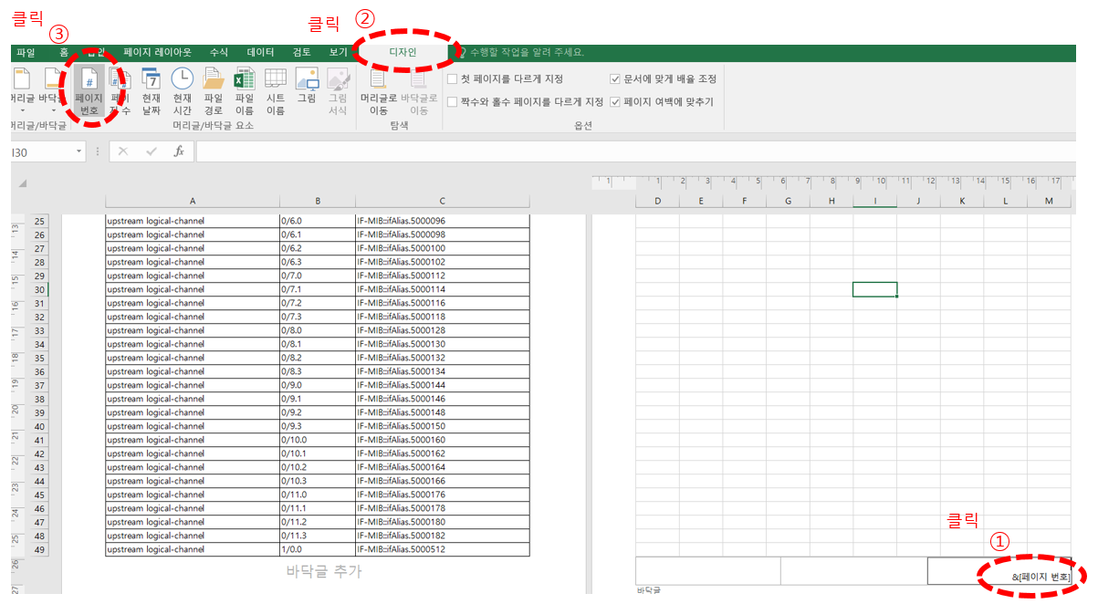엑셀로 작업한 문서의 페이지 수가 1페이지 이상일 때 프린트(인쇄)할 경우 문서 하단에 페이지를 표시하는 방법을 살펴보겠습니다.